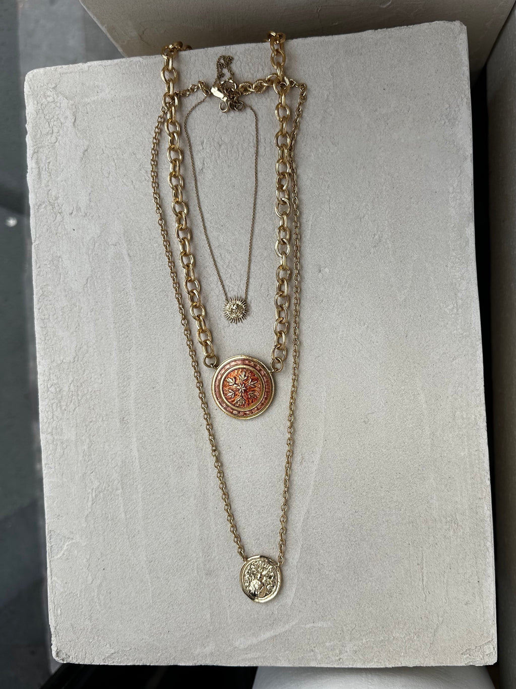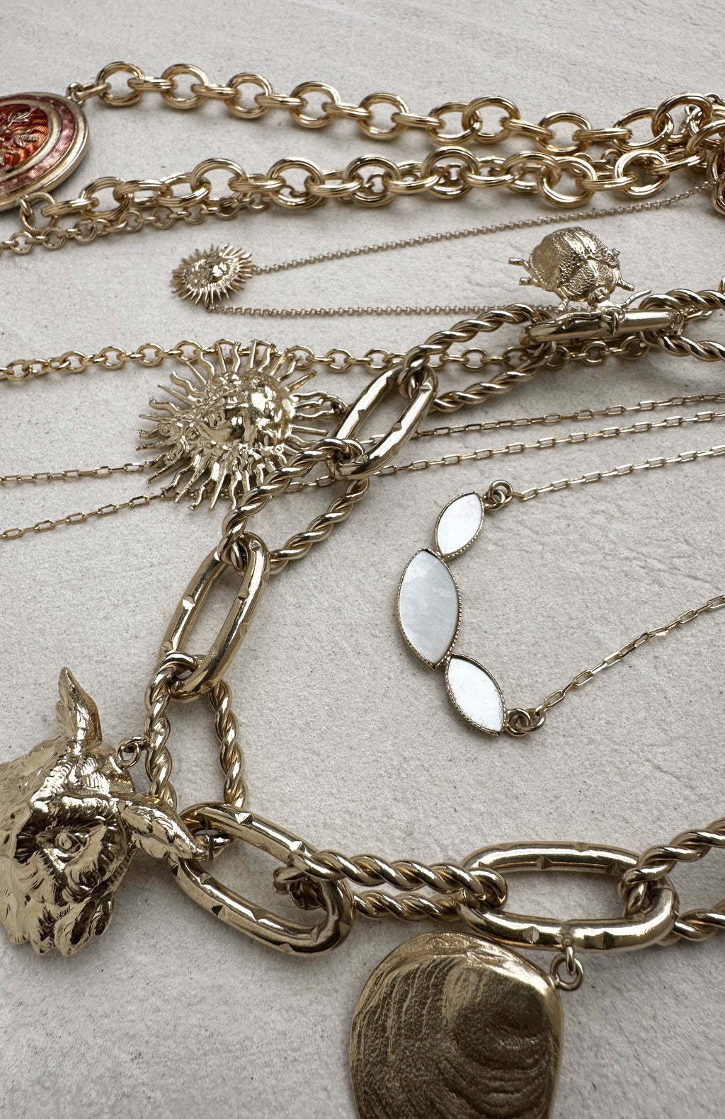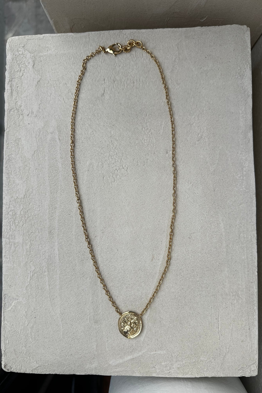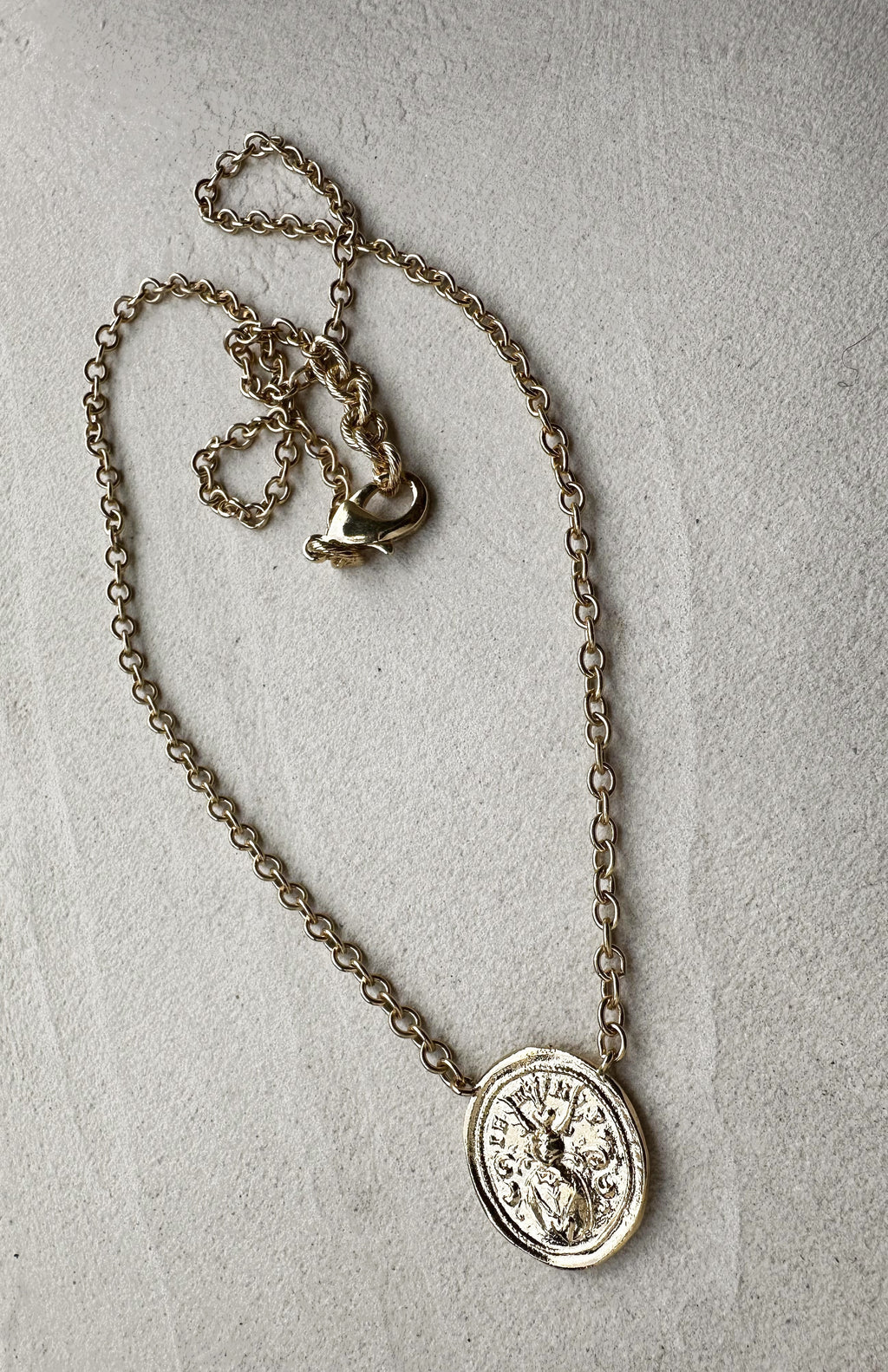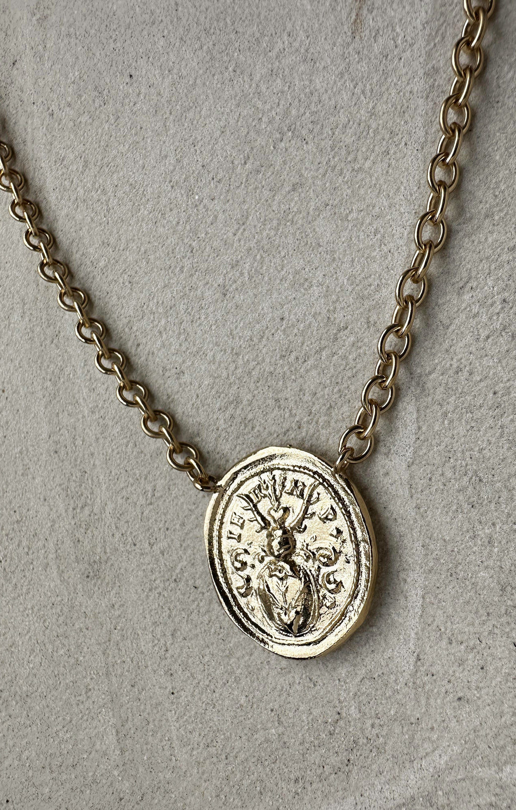 Ce collier est fait d'un dessin d'un sceau ancien dans lequel on peut voir des bois de cerf, un cœur, des flèches... monté sur une chaine aux maillons épais. Ce collier est fabriqué à Paris. De notre atelier en passant par le moulage, la matrice, la dorure etc... Un objet unique que vous ne trouverez pas au cou de quelqu'un d'autre.